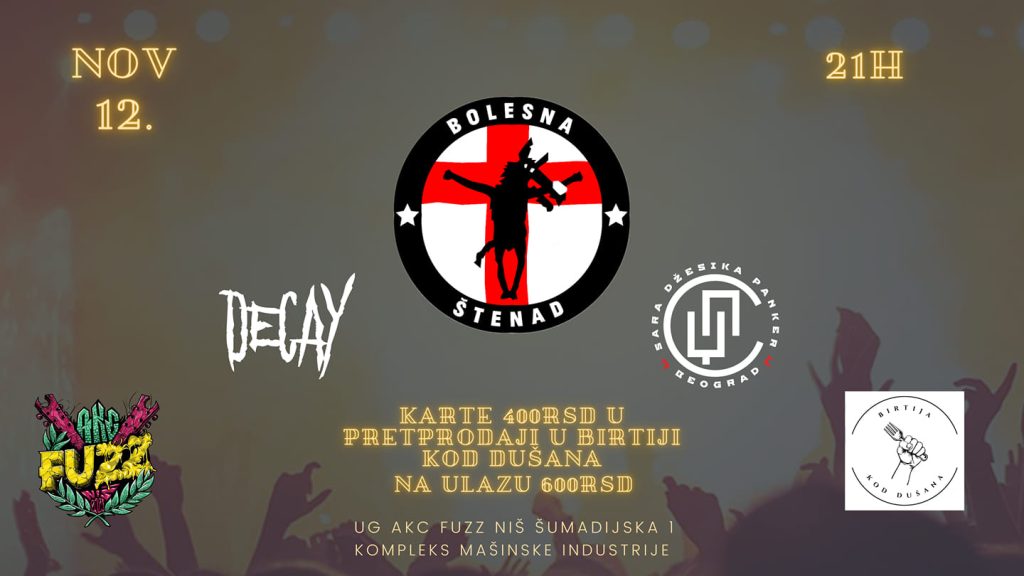 U subotu sa početkom od 21h u AKC Fuzz u Nišu nastupiće bendovi Bolesna Štenad, Sara Džesika Panker uz podršku mladih lokalaca Decay.