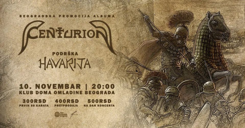 Centurion je beogradski metal bend osnovan 2008. godine. U okosnici njihovog zvuka leži tradicionalni heavy metal zvuk nalik na Iron Maiden i Judas Priest, koji je vešto ukombinovan sa progresivnim elementima, elementima ekstremnijih metal žanrova i balkanskim etno uplivima koji su svojevrsni lični pečat ovog mladog benda. Centurion već uveliko važi za koncertnu atrakciju, puneći redovno kako beogradske, tako i klubove širom Srbije. 2019. godine je izašao njihov album prvenac koji je naišao na fenomenalan odziv publike, a bend je trenutno u ciklusu koncertne promocije svog debi ostvarenja, u sklopu koje sa velikim zadovoljstvom dolaze i u Dom Omladine Beograda, 10. novembra 2022!
