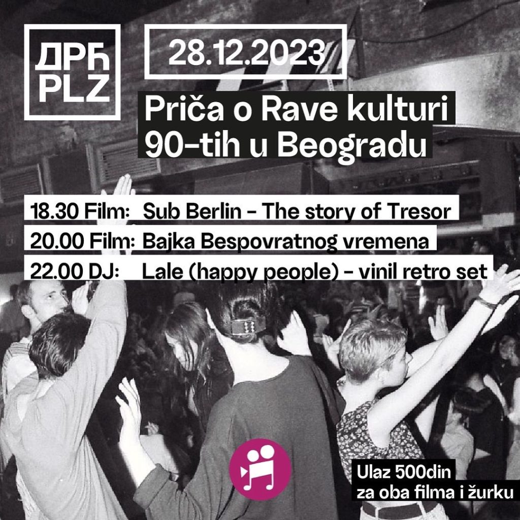 Vreme je za čas urbane istorije u Dorćol Platzu u saradnji sa festivalom muzičkog dokumentarmog filma Dok’n’Ritam. Tema je ovog puta rave kultura 90- ih godina u Beogradu. U vreme kad je Srbija bila pod sankcijama, gradovi bombardovani, a narod dane provodio na ulicama i u skloništima, neki ljudi svoju sreću pronalaze u tek začetoj “rave” supkulturi.