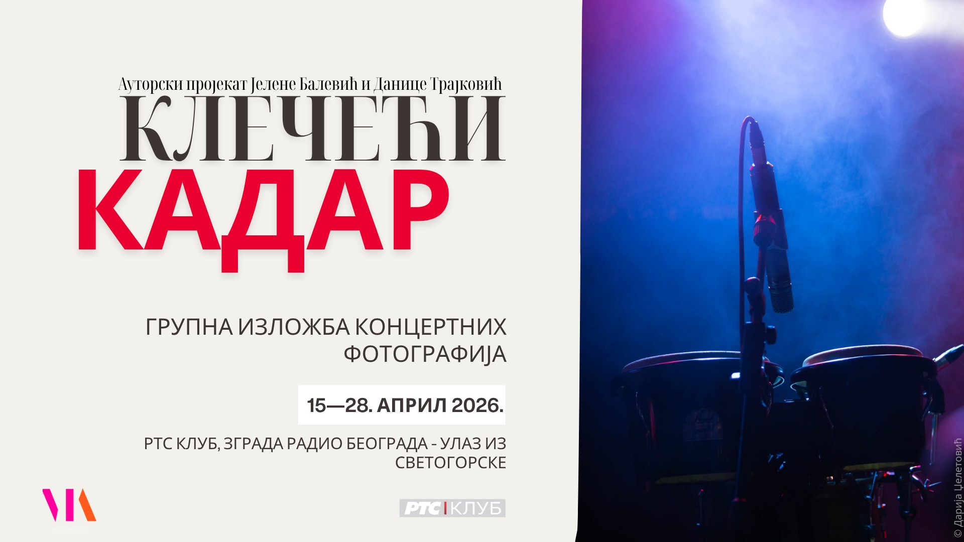 U organizaciji udruženja Modernator, u prostoru RTS Kluba biće otvorena izložba koncertne fotografije „Klečeći kadar“, u sredu, 15. aprila 2026. godine u 18 časova.