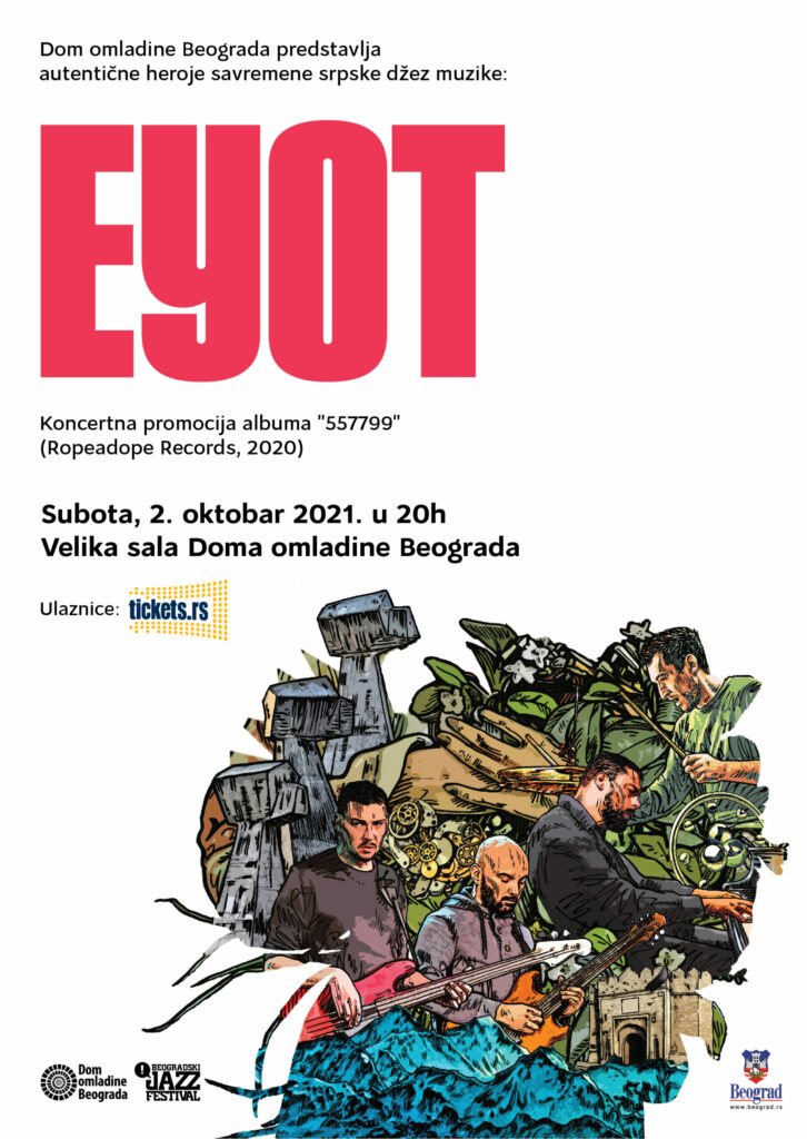 Solistički koncert grupe Eyot, autentičnih heroja savremene srpske džez muzike, koji je ujedno i promocija albuma “557799“, biće održan u subotu, 2. oktobra u Velikoj sali Doma omladine Beograda.