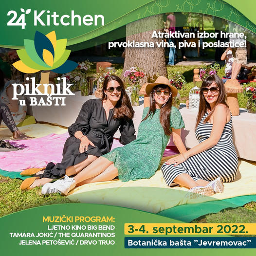 Bogata i sadržajna manifestacija “24 Kitchen – Piknik u Bašti” po drugi put biće održana 3. i 4. septembra od 13 do 20h u Botaničkoj bašti “Jevremovac”, gde će nastupati hrvatski sastav Ljetno Kino Big Band, fado umetnica Tamara Jokić i drugi.