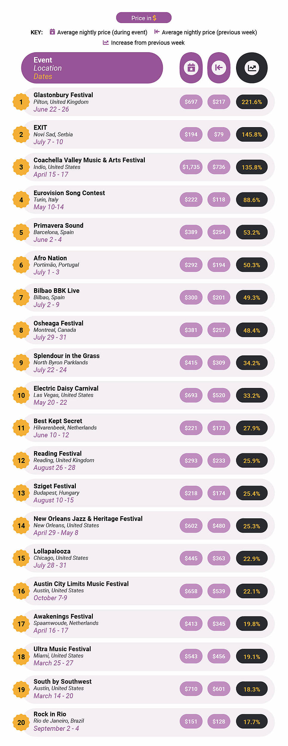 Money je posmatrao prosečne cene noćenja za Airbnb nekretnine tokom nekih od najvećih događaja širom sveta u 2022. i upoređivao ih sa troškovima boravka u istoj rezidenciji nedelju dana pre samog festivala kako bi pokazao povećanje direktno povezano sa događajem.