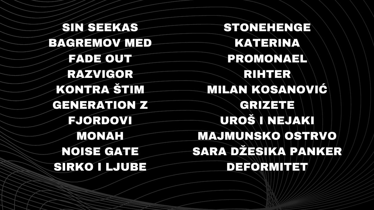 Grizete, Generation Z, Fade Out, Fjordovi, Sara Dzzesika Panker, Bagremov med, Uross i nejaki, Sin Seekas, Rihter, Razvigor, Sirko i Ljube, Stonehenge, Noise Gate, Monah, Milan Kosanović, Majmunsko ostrvo, Kontra SStim, Deformitet, Promonael, Katerina.