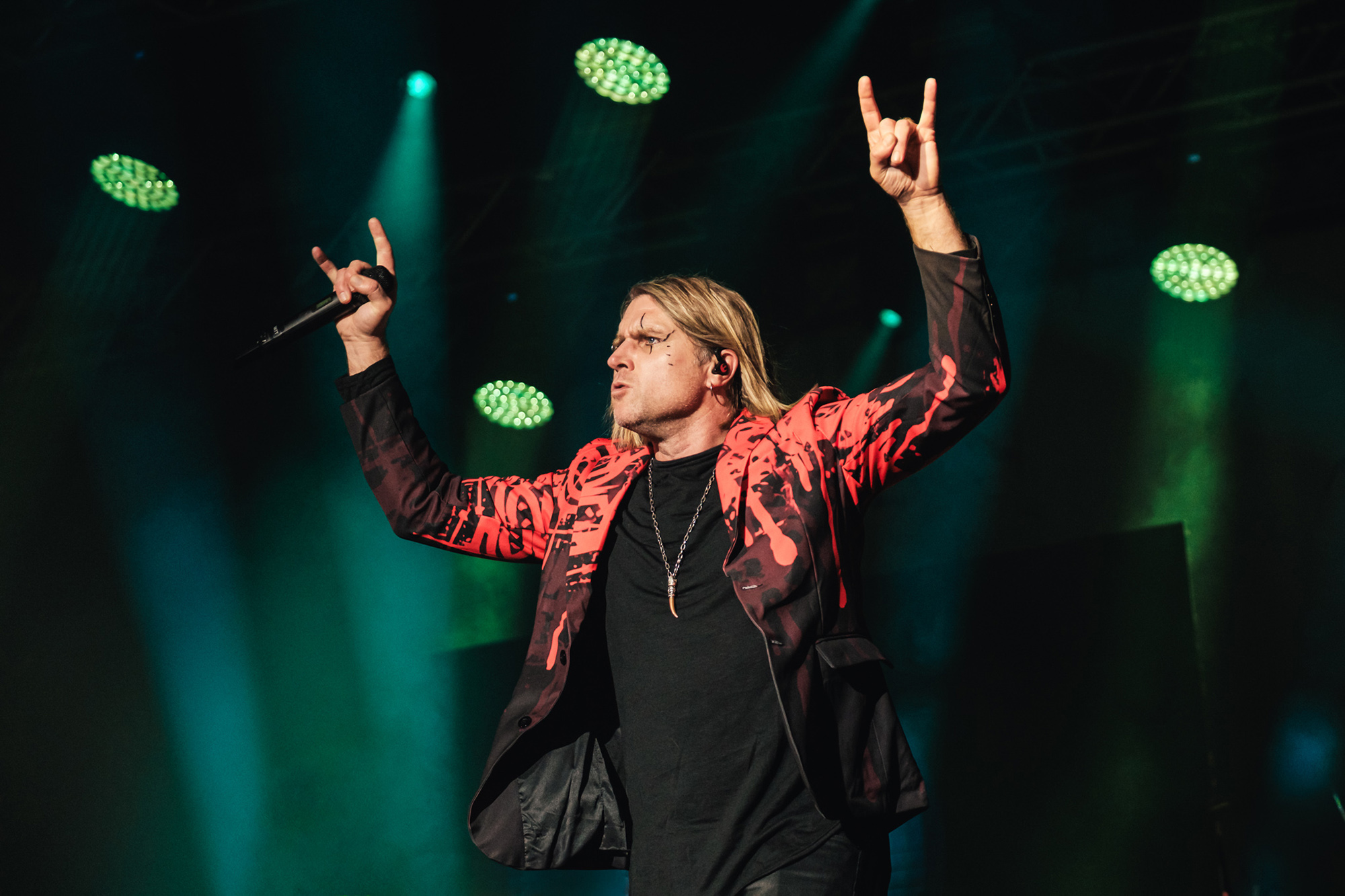 Basista Aleks Espiritu ga je pratio u stopu scenskim pokretima, neodoljivo podsećajući na mešavinu Sleša i Fila Lajnota.