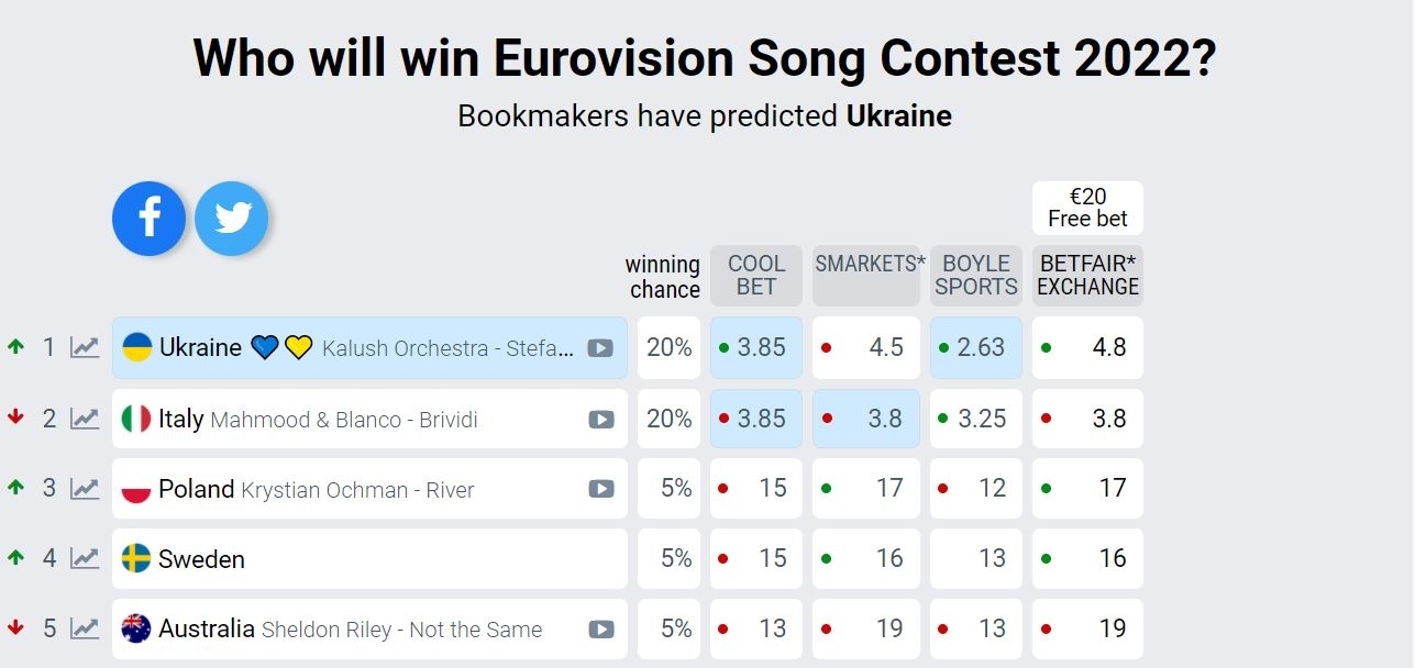 Pesma “Stefania” popela se na vrh kladionica u poslednjih par dana. Izgleda da Evropljani na sve načine žele podržati Ukrajince te se veliki broj fanova Eurosonga kladi upravo na Ukrajinu. Ili će možda baš zato Ukrajina pobediti, zbog političke koreknosti ?