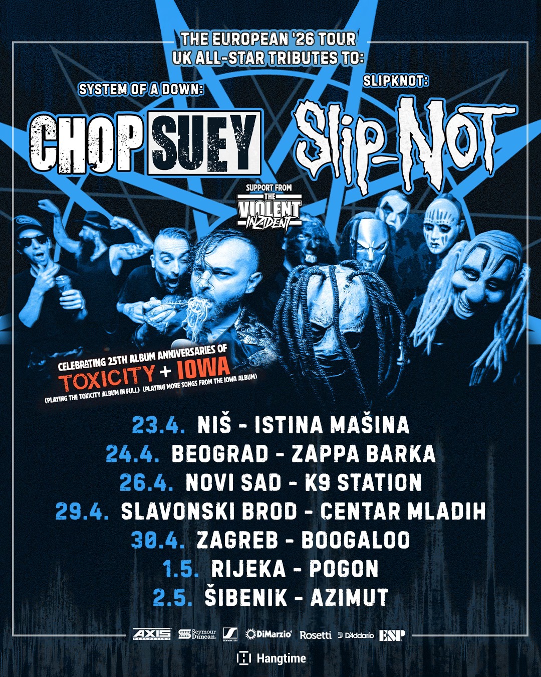Teško da može biti drugačije kada se na jednom mestu okupi toliko vrhunskih muzičara sa doslovno hiljadama odsviranih koncerata. Na ovoj regionalnoj turneji pridružuju im se i nu-metal majstori parodije, The Violent Inzident, koji će se premijerno predstaviti domaćoj publici. Koncerti će se održati 23.4. u niškoj Istini Mašini, 24.4. u beogradskoj Zappa Barci te 26.4. u novosadskom K9 Stationu. Poseban povod je 25 godina kultnih albuma „Toxicity“ i „Iowa“. Očekujte neviđeni spektakl posvećen klasicima koji su obeležili čitavu jednu generaciju. Ulaznice se po pretprodajnoj ceni mogu nabaviti putem Gigstix-a i na fizičkim prodajnim mestima u svakom od gradova.